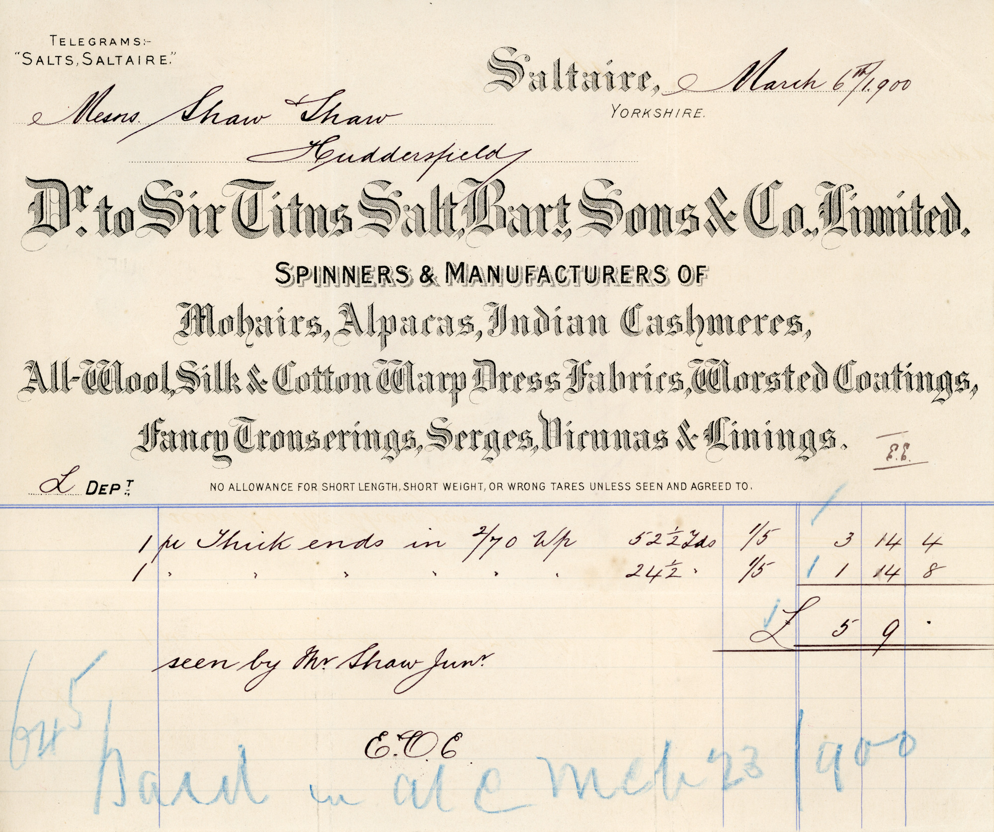 Bill for 'Thick ends' from 'Sir Titus Salt Bart, Sons & Co' March 6th 1900