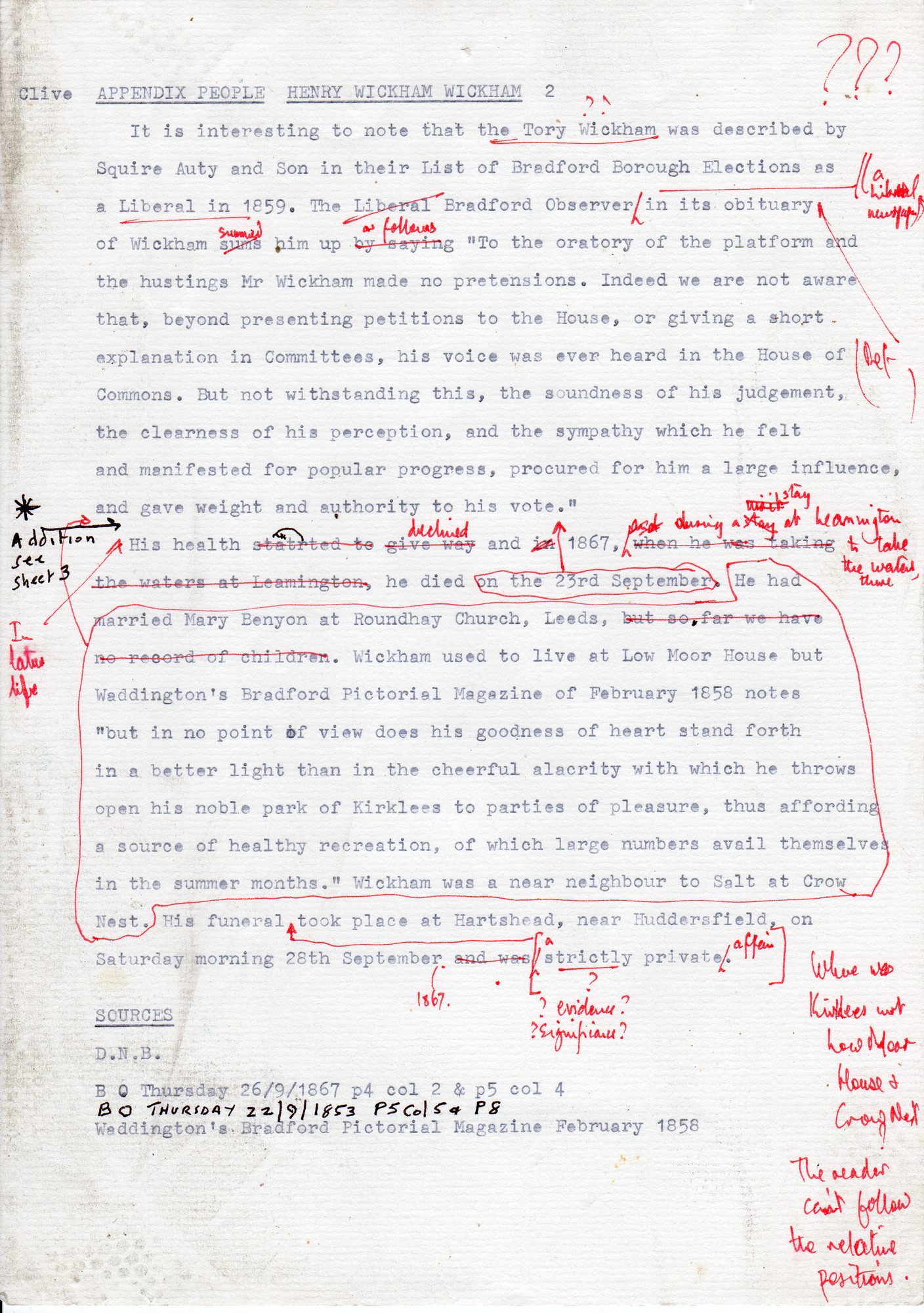 Set of typed notes on biographies of various nineteenth century well known families with some connection to Saltaire.