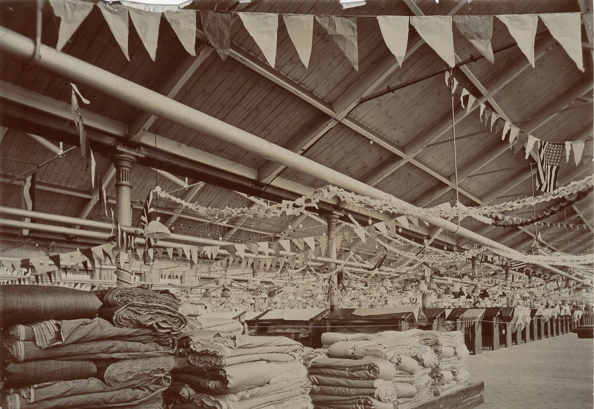 Photograph shows a number of burling and mending tables with a large pile of grey pieces (unfinished cloth) in the foreground. The room is decorated with bunting and decorations
