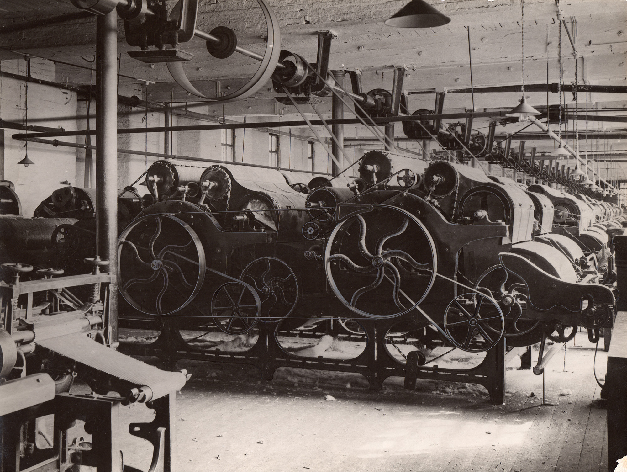 photograph shows the doffing end of worsted carding engine