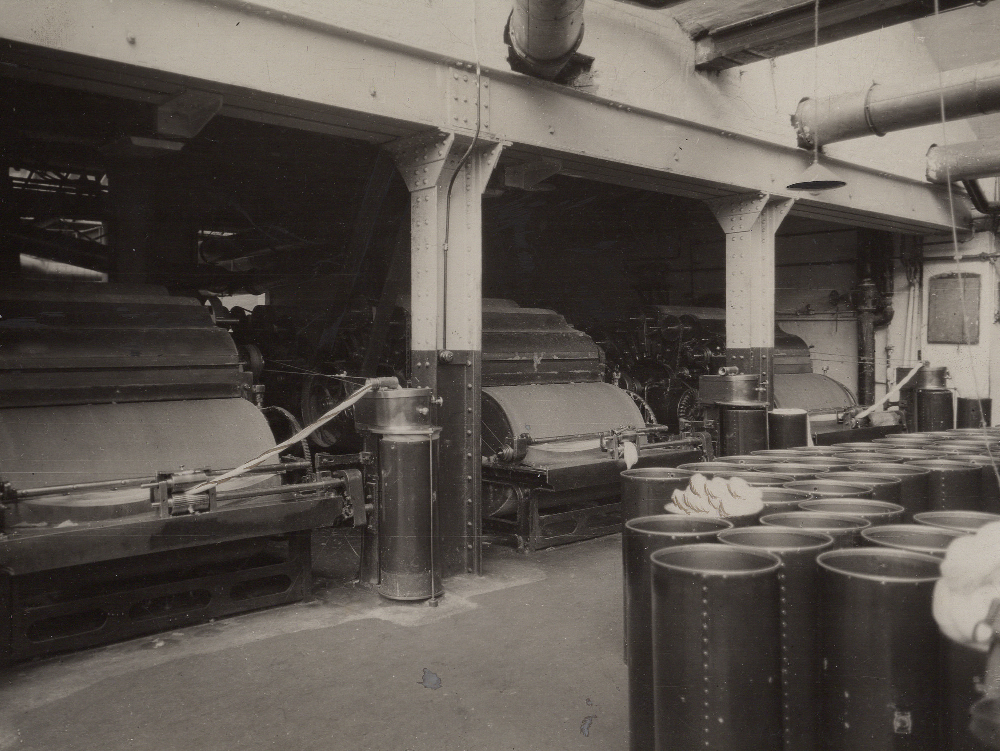 Room containing 3 carding machines in combing shed. Doffing (delivery end) of card.