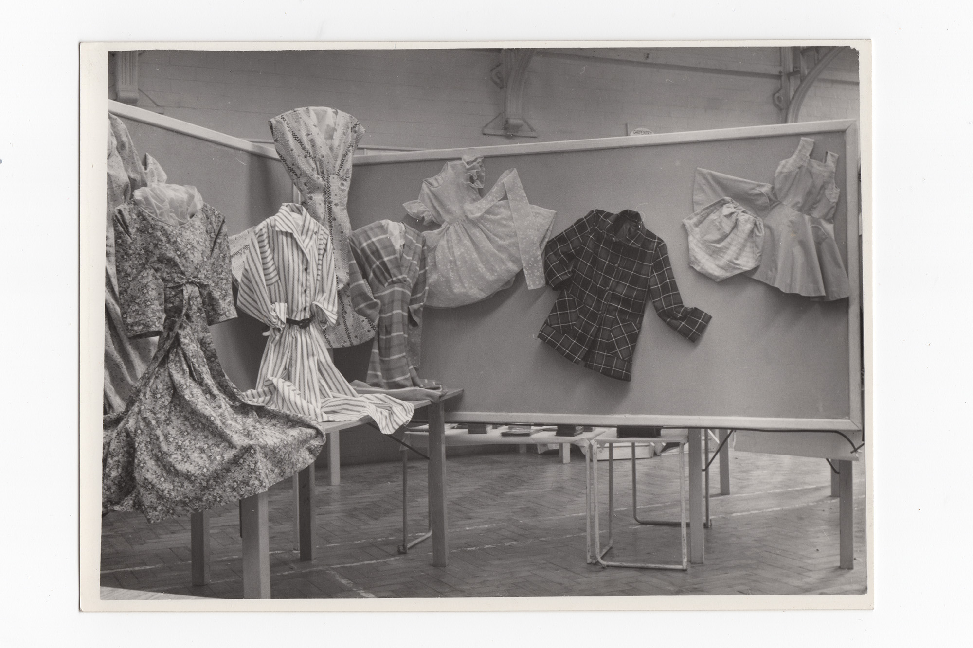 Black and white photograph (16.7cmx12.1cm) of display of womens and girls' clothing. There are seven different garments including a variety of dresses. Possibly part of an adult education classes display. See also 2019.46.13, 2091.46.14, 2019.46.20.3, 2019.46.20.2, 2019.46.20.4