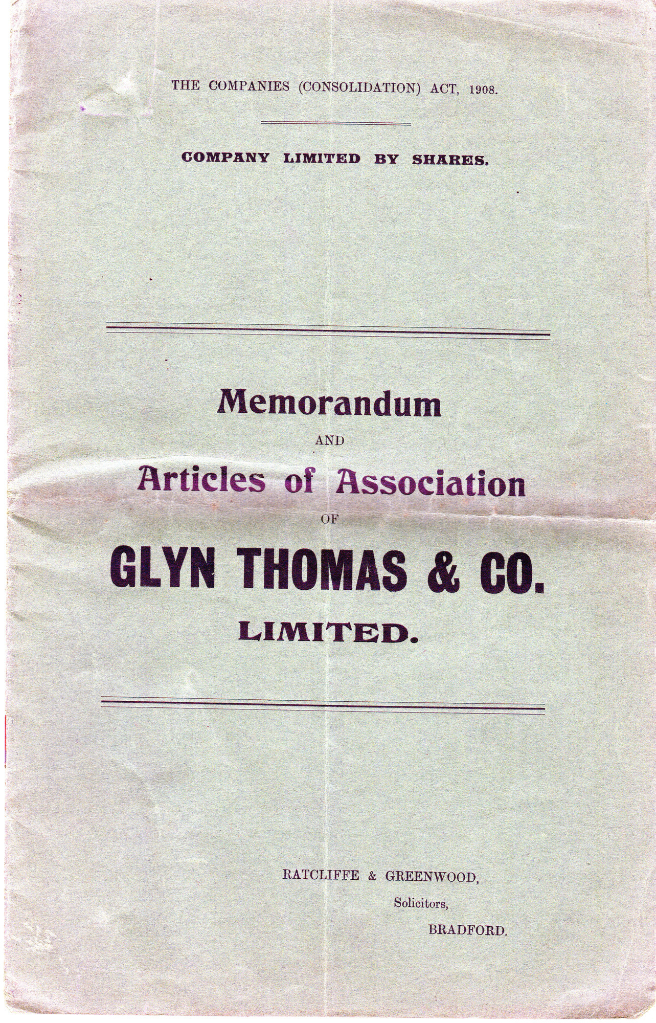 Memorandum of Association for the Incorporation of Glyn Thomas and Co. Ltd. Flock Manufacturer