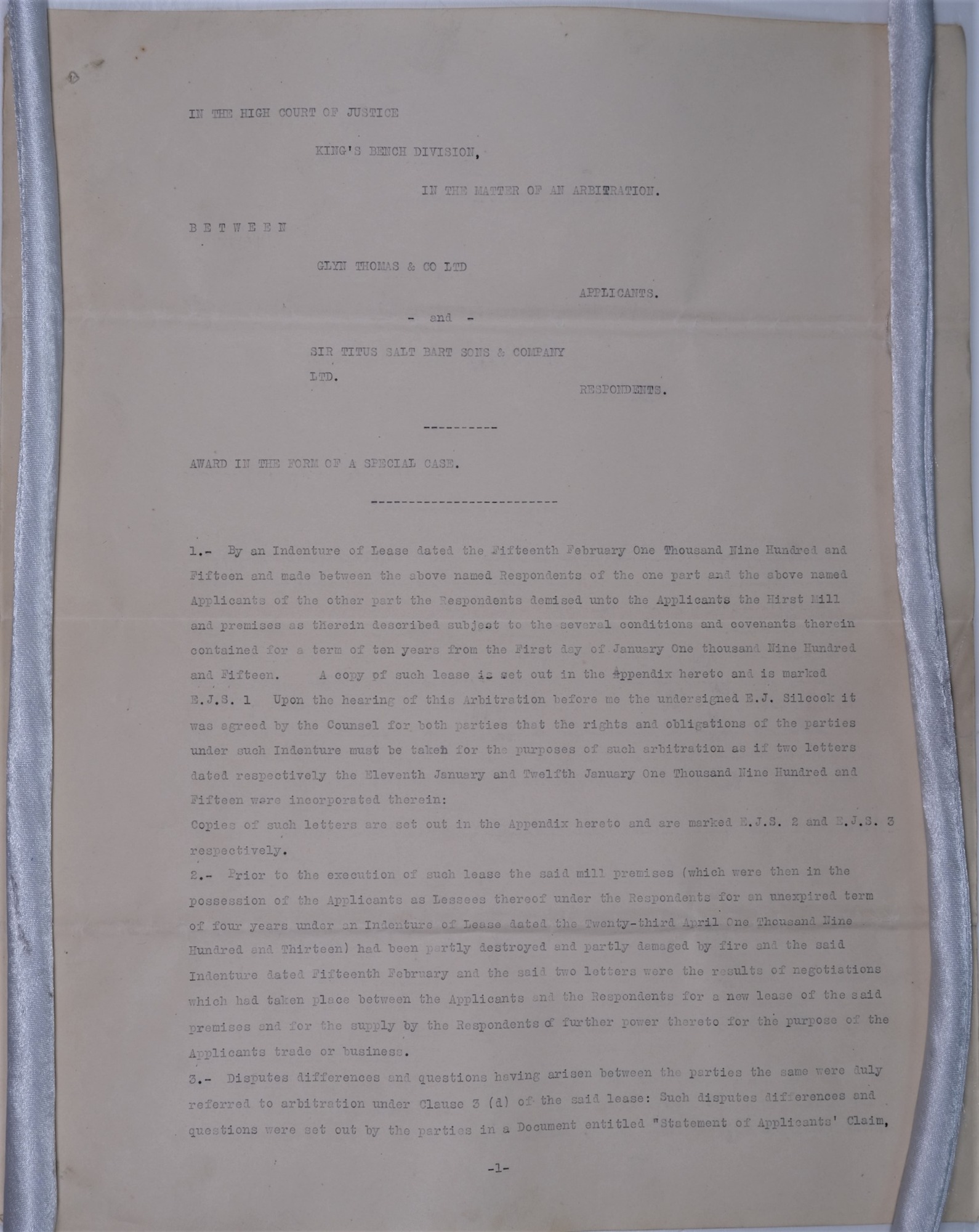 A high court arbitration brought by the applicant Glyn Thomas and Co. against the respondant Sir Titus Salt (Bart) Sons and Co. Ltd. - 15/07/1918