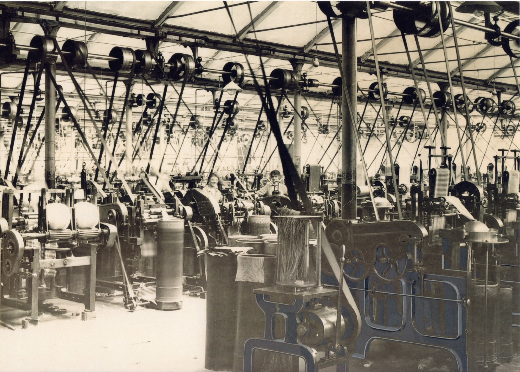 Photograph shows 2 workers in the middle of a combing shed. Gill Boxes in foreground.