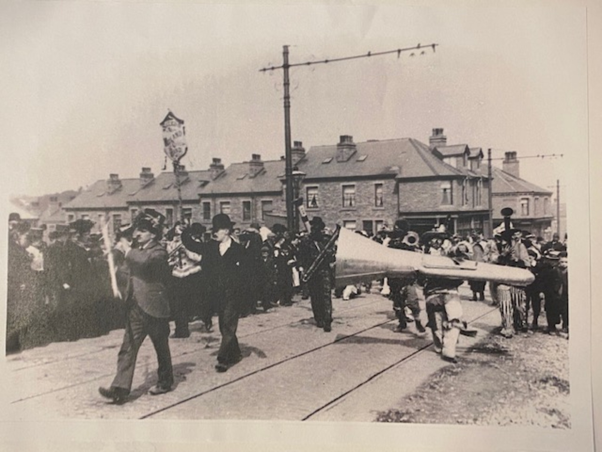 Photograph showing the comic band in gala procession on Saltaire Road about 1912