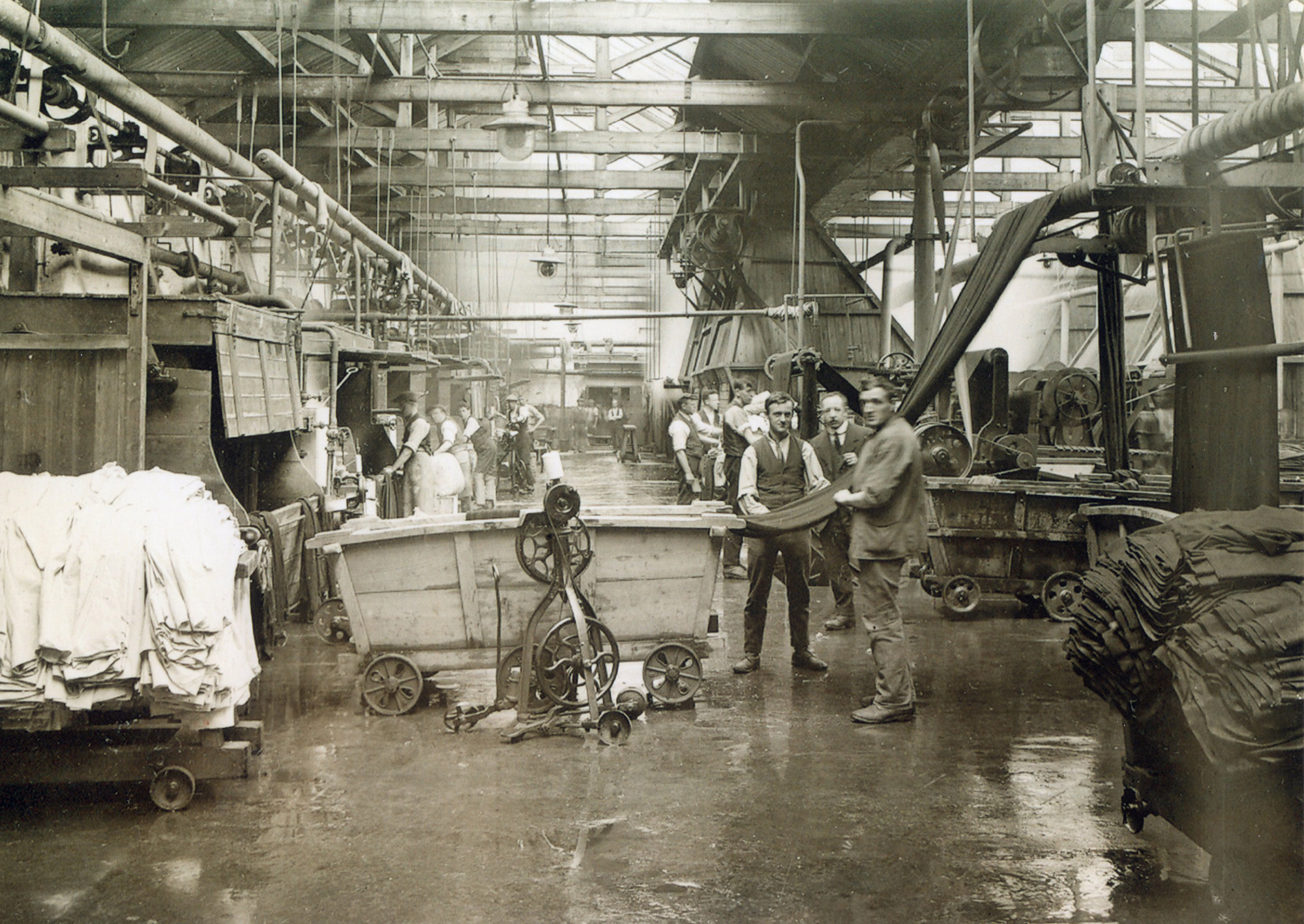 Photograph shows New Mill. Three men are holding a piece of cloth to the right of a wheeled truck. In the background workers stand in front of dyeing machinery. There are two piles of clothv in the foreground - the left is piled with white cloth, the right with darker cloth