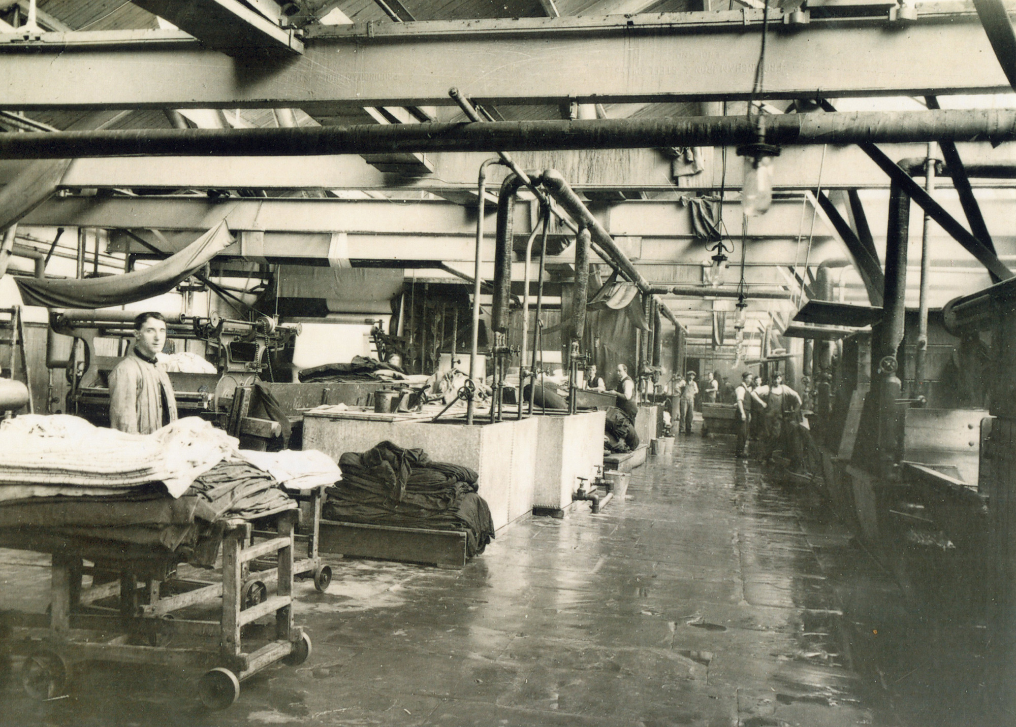 Male worker standing in the left foreground behind a table piled with two different types of coloured cloth. A piece of cloth is suspended over his head. A group of men are in the background