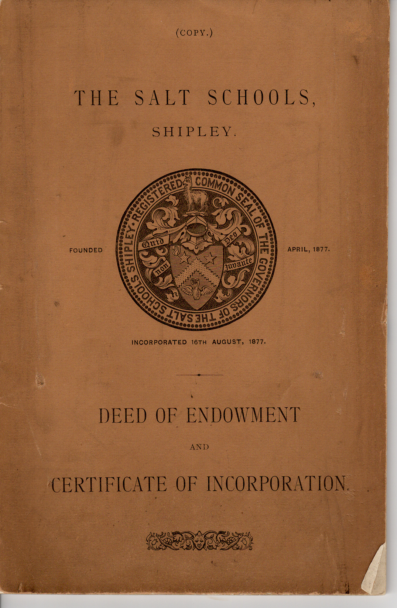 2 original copies of 'The Salts Schools, Shipley, Deed of Endowment & Certificate of Incorporation 1877
