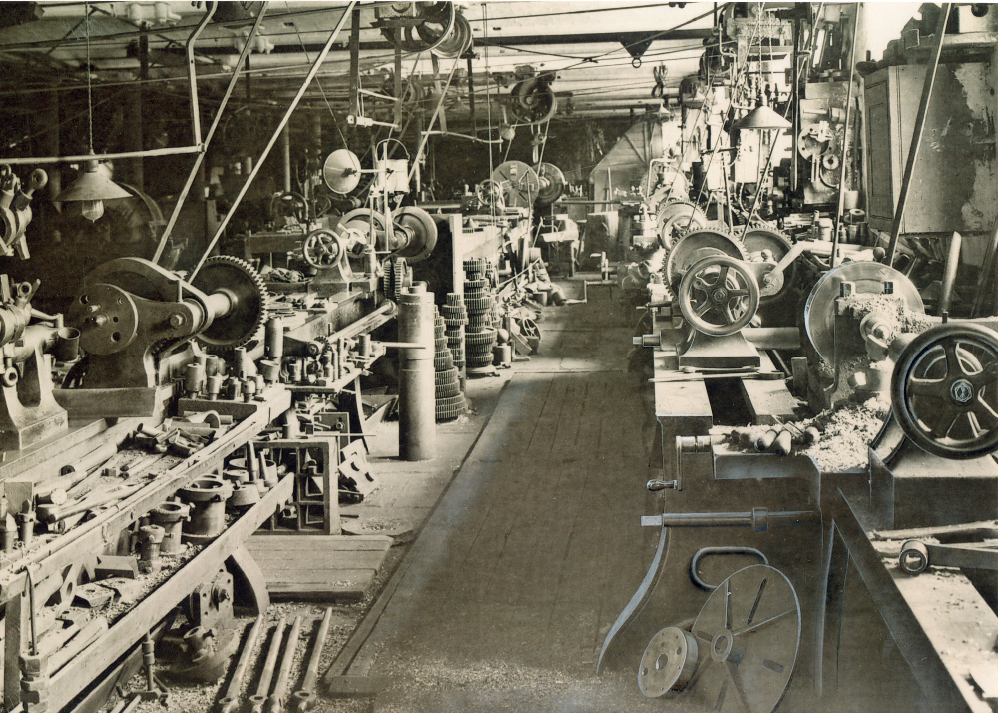 Photograph shows the inside of an engineers shop. There are machines to the left and right with three piles of wheels in the middle. To the right of the picture are two wheels leaning against a machine.