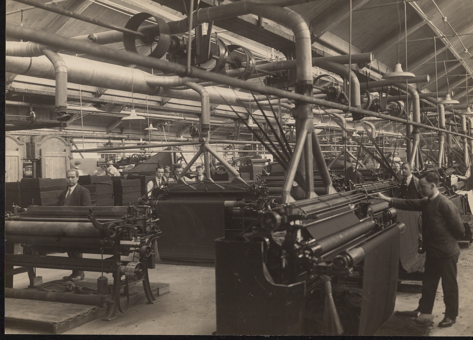 Photograph shows finishing machinery. On the left hand side a man stands behind a small machine with a group of four men behind him. To the right stands a manwith his left arm behind his back.