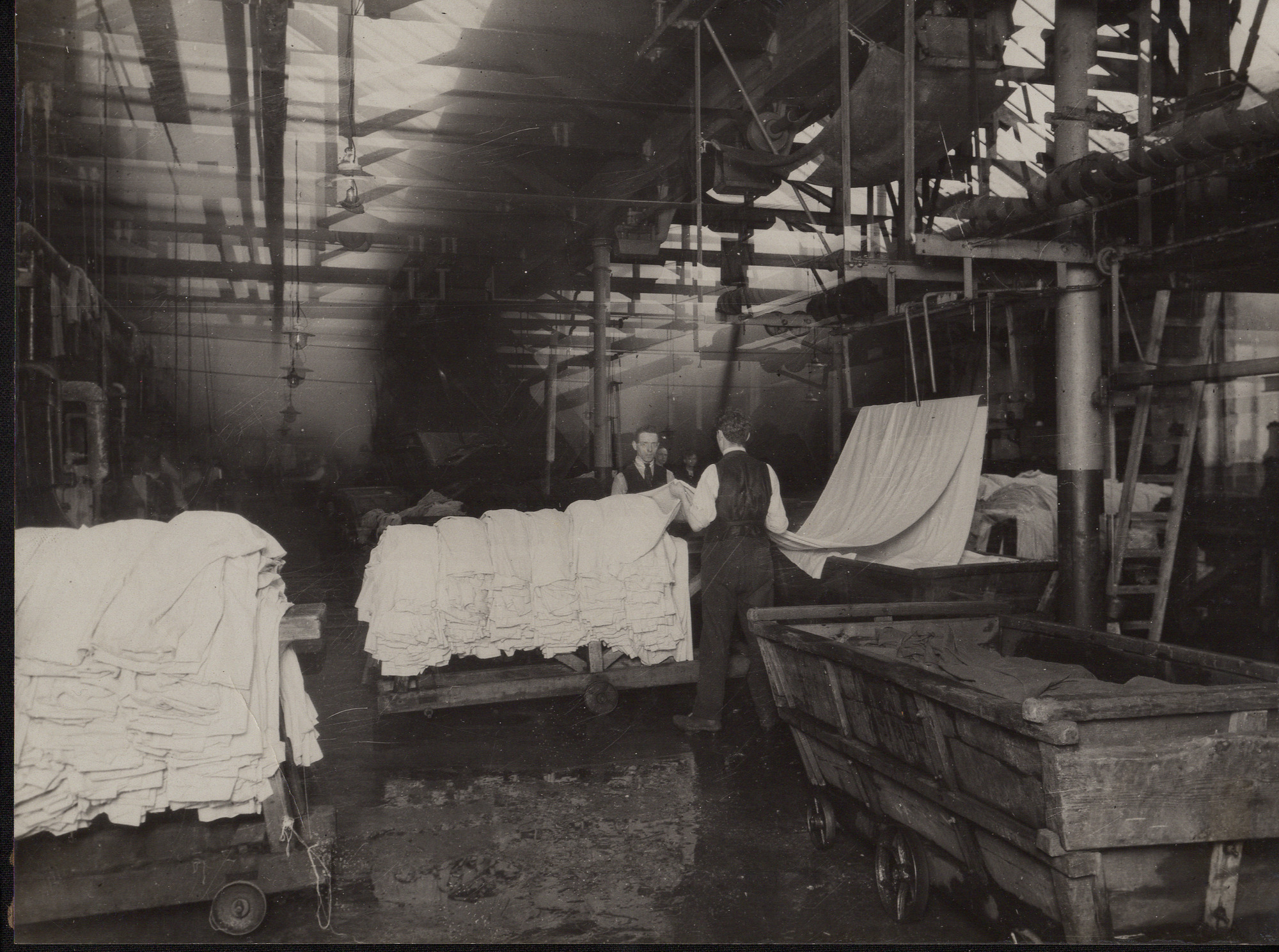 Photograph shows the finishing room with two men holding a length of white cloth. There is another pile of white cloth to the left of the photograph. To the right is a truck containing coloured cloth with a step ladder behind it