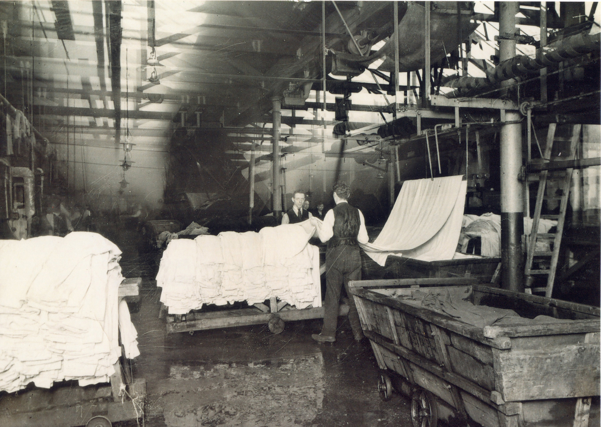 Photograph shows the finishing room with two men holding a length of white cloth. There is another pile of white cloth to the left of the photograph. To the right is a truck containing coloured cloth with a step ladder behind it.