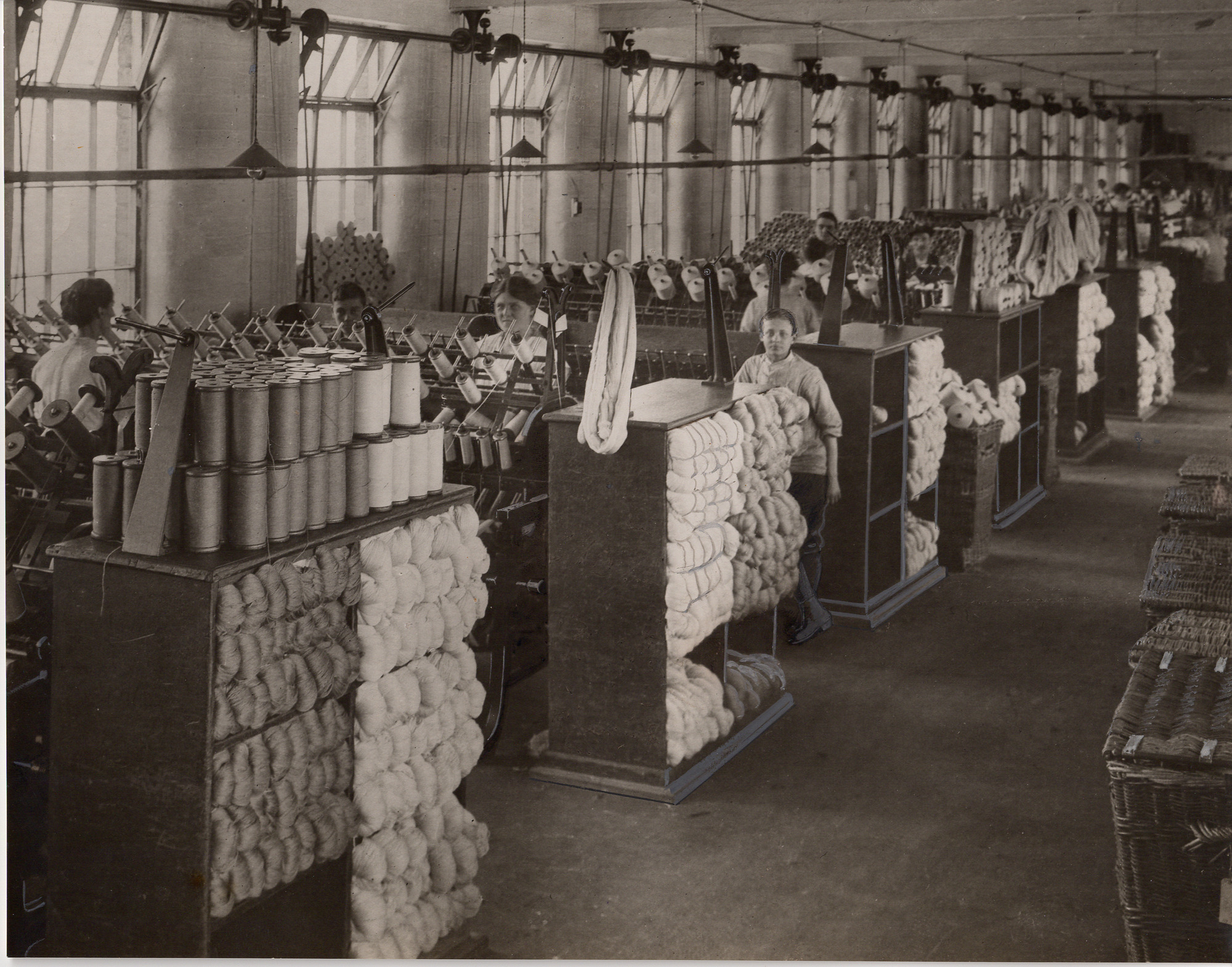 Photograph shows close ups of four workers standing among machines. There are 6 cupboards containing yarn. The cupboard in the foreground is piled with bobbins. There are 4 baskets to the right of the picture. The back of the photograph says ' A corner of a meeting room'