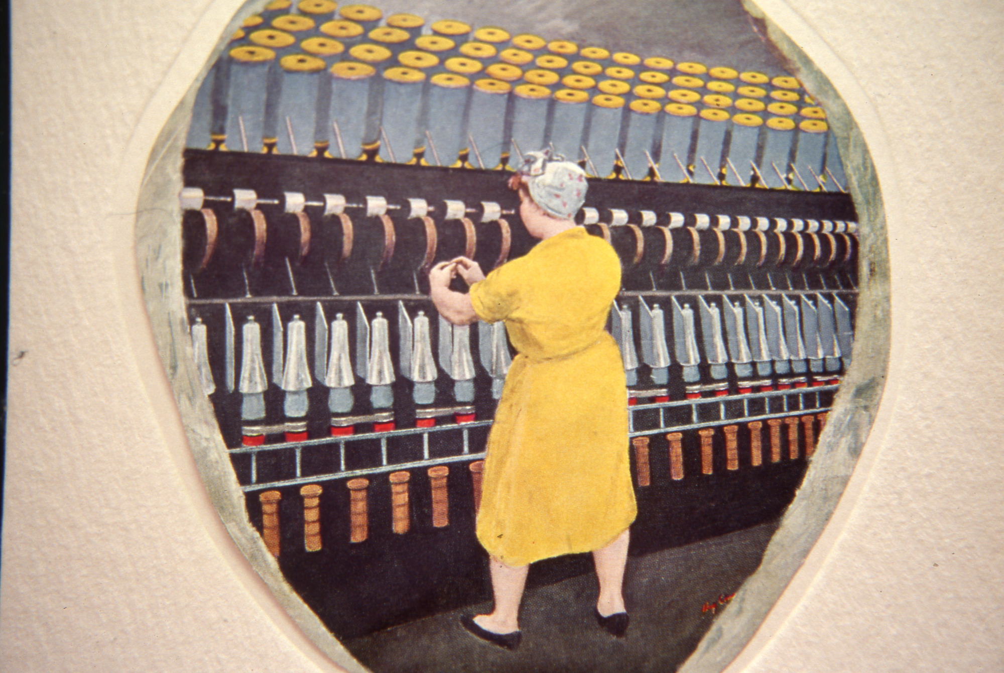 Henry Carr painting Cap spinning. One of a collection of Slides relating to Saltaire compiled by Albert Bowtell.