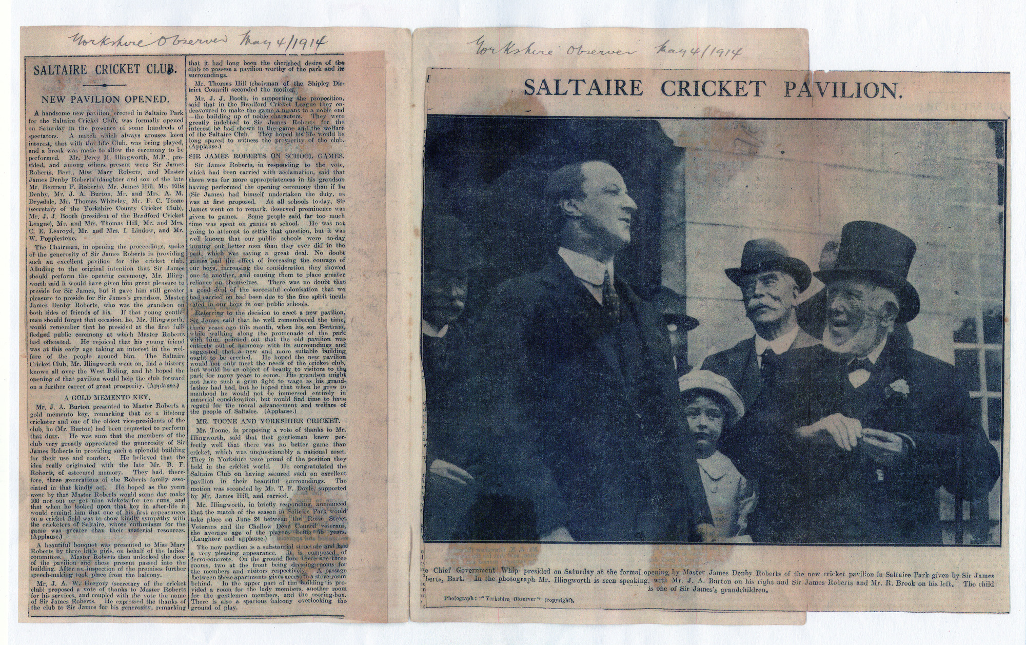 Article and photograph from the Yorkshire Observer newspaper of Sir James Roberts with grandchildren at the opening of the Saltaire Park Cricket Pavillion, May 1914. Sir James is pictured between Percy Illingworth MP, the Chief Government Whip and MP for Shipley, and Mr R Brook. Sir James Roberts had funded the building of the pavillion.