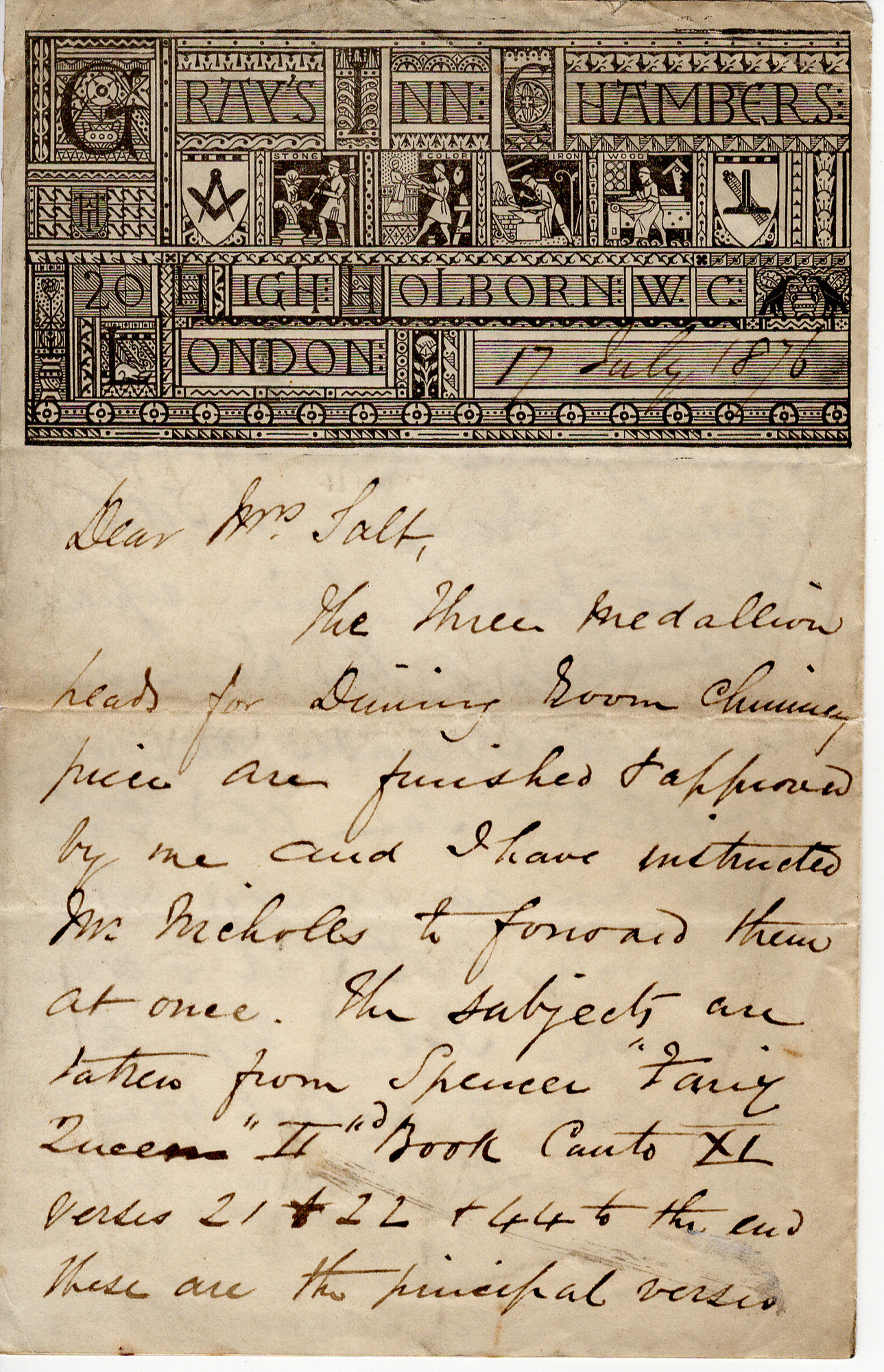 Letter to Mrs Salt from Thomas Harris, the architect of Milner Field, relating to Medallion Heads on Dining Room Chimney-piece (1876)