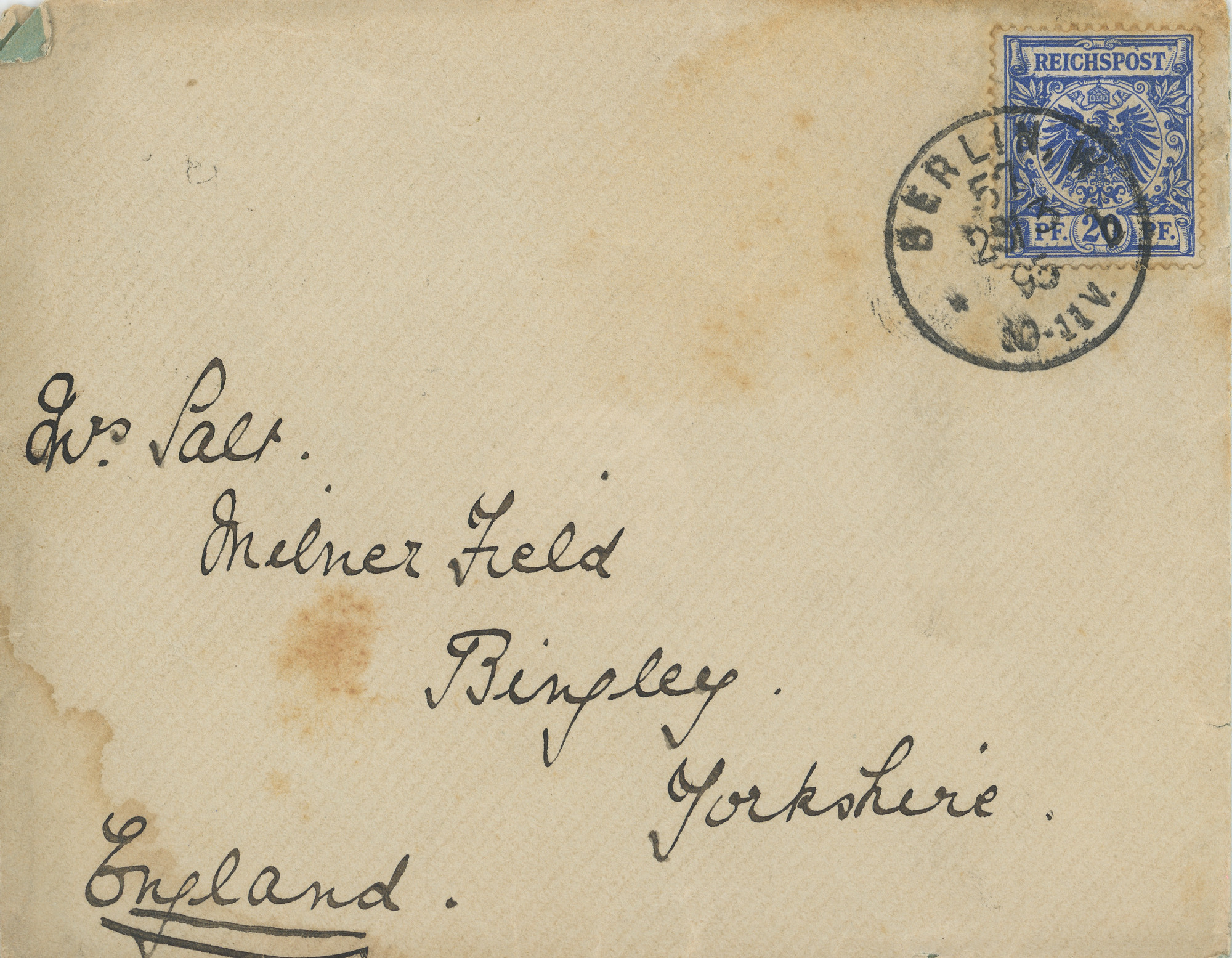 A letter from Isabel Salt, to Catherine Salt at Milner Field. In envelope postmarked Berlin [1895]. Written on a train travelling from Dresden. Includes account of her time spent in Dresden with friends.