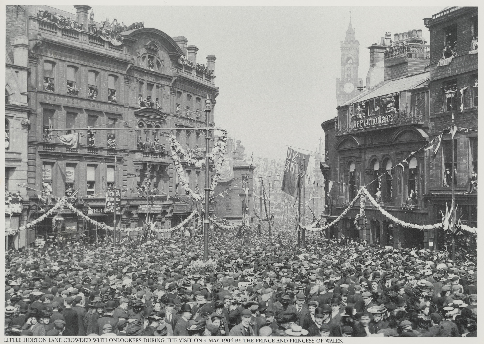 Photograph of a large crowd of people completely filling a square on Little Horton Lane in Bradford on 4 May 1904 during a visit by the Prince and Princess of W