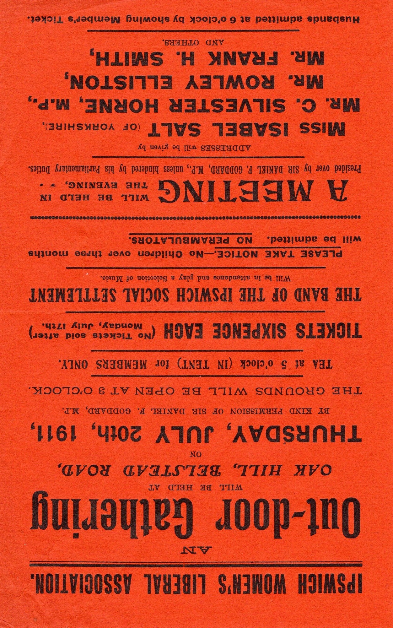 Flyer for Outdoor Gathering, Ipswich Women's Liberal Association, address by Isabel Salt (20.07.1911)
