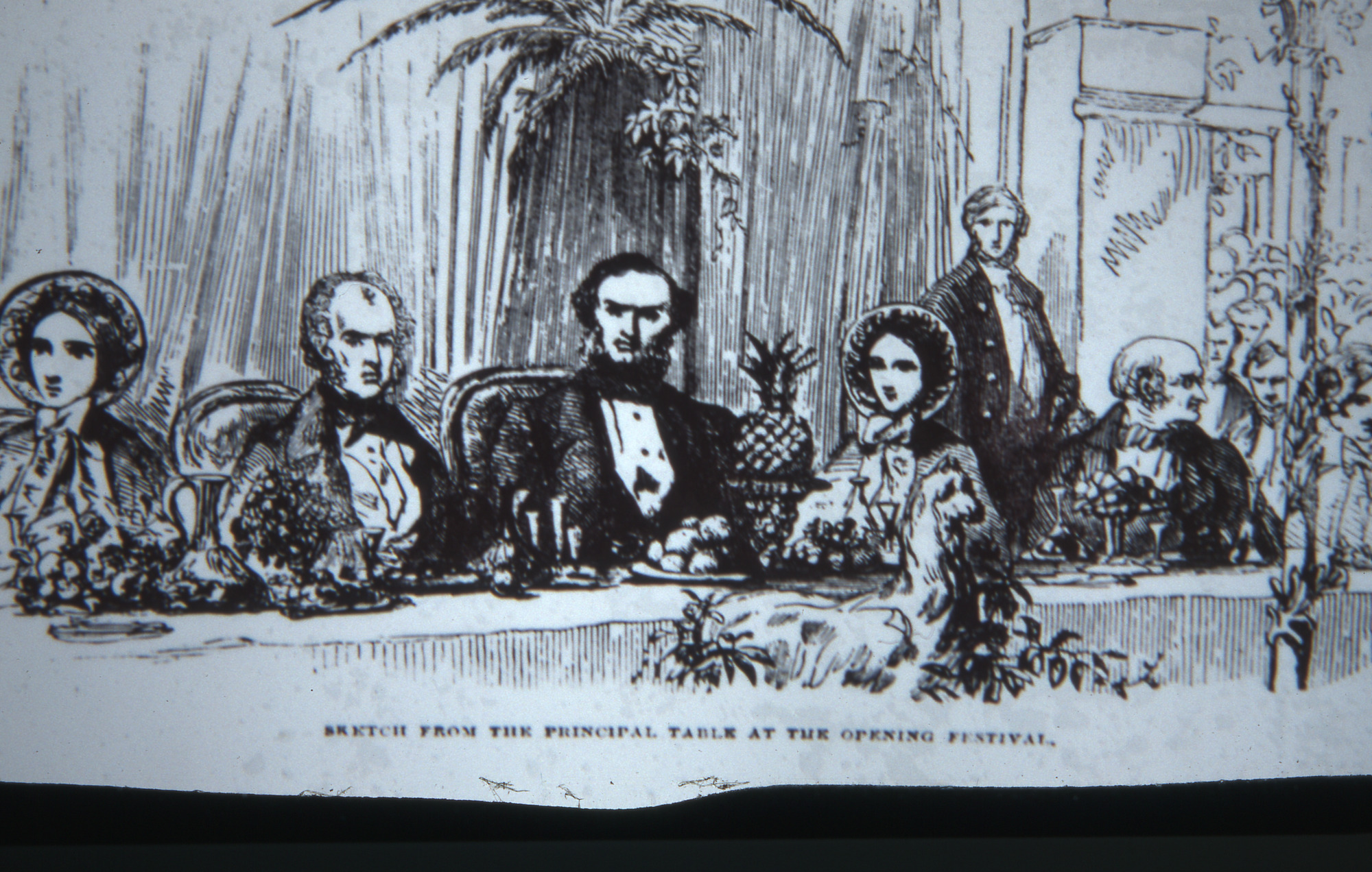 Print of opening of mill 'Top Table'. One of a collection of Slides relating to Saltaire compiled by Albert Bowtell.