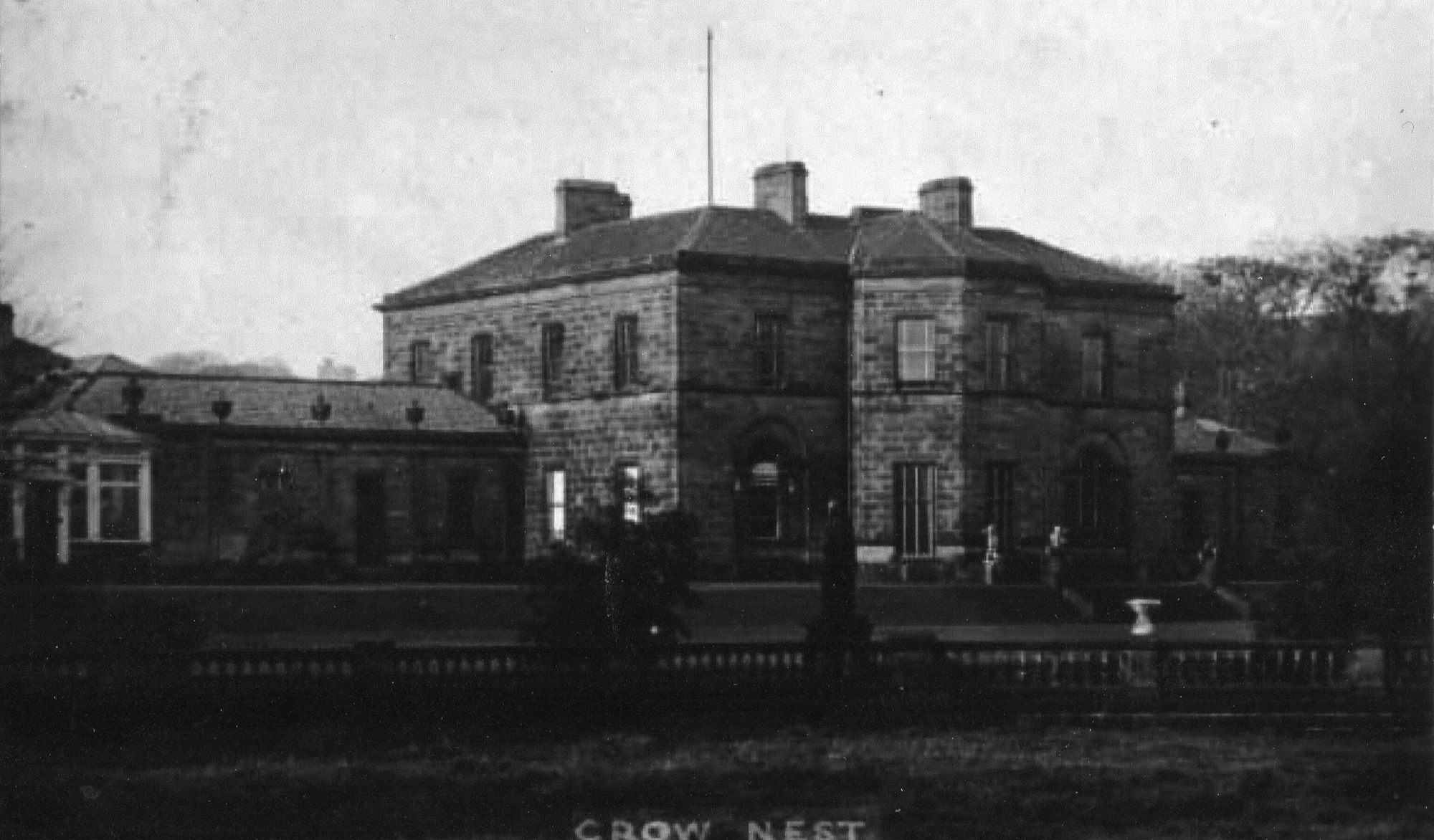 A photograph of the rear of the central part of Crow Nest, a favoured home of Sir Titus Salt. The photograph shows the central part of the building with a garden and fencing in front.