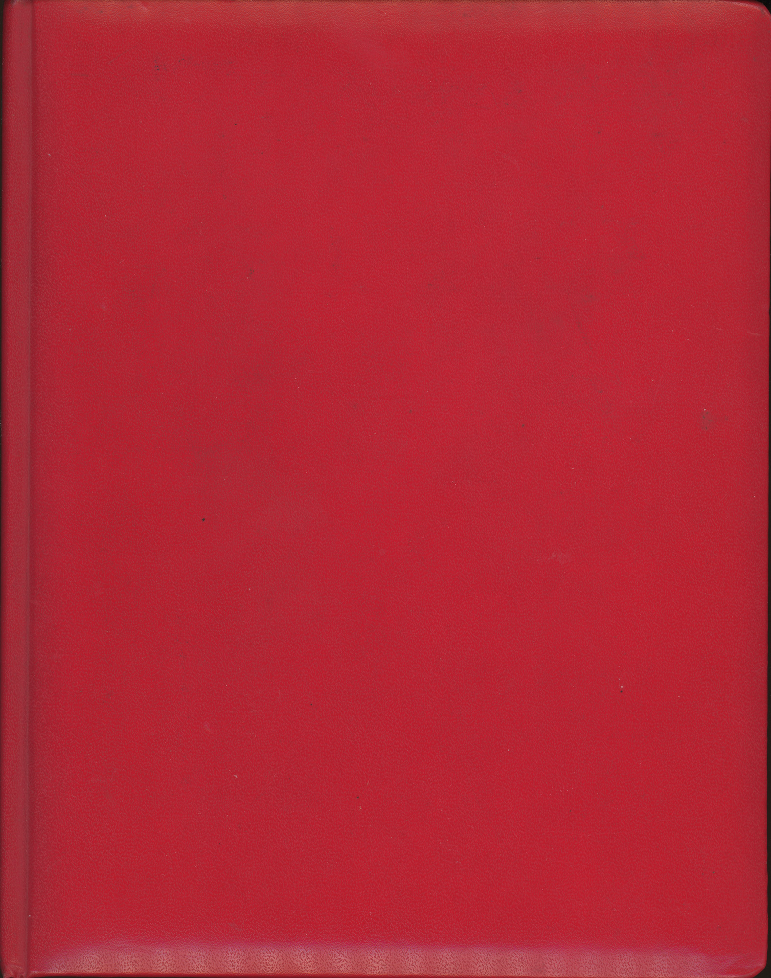 Red album with black pages containing 104 postcards and prints of images of Saltaire