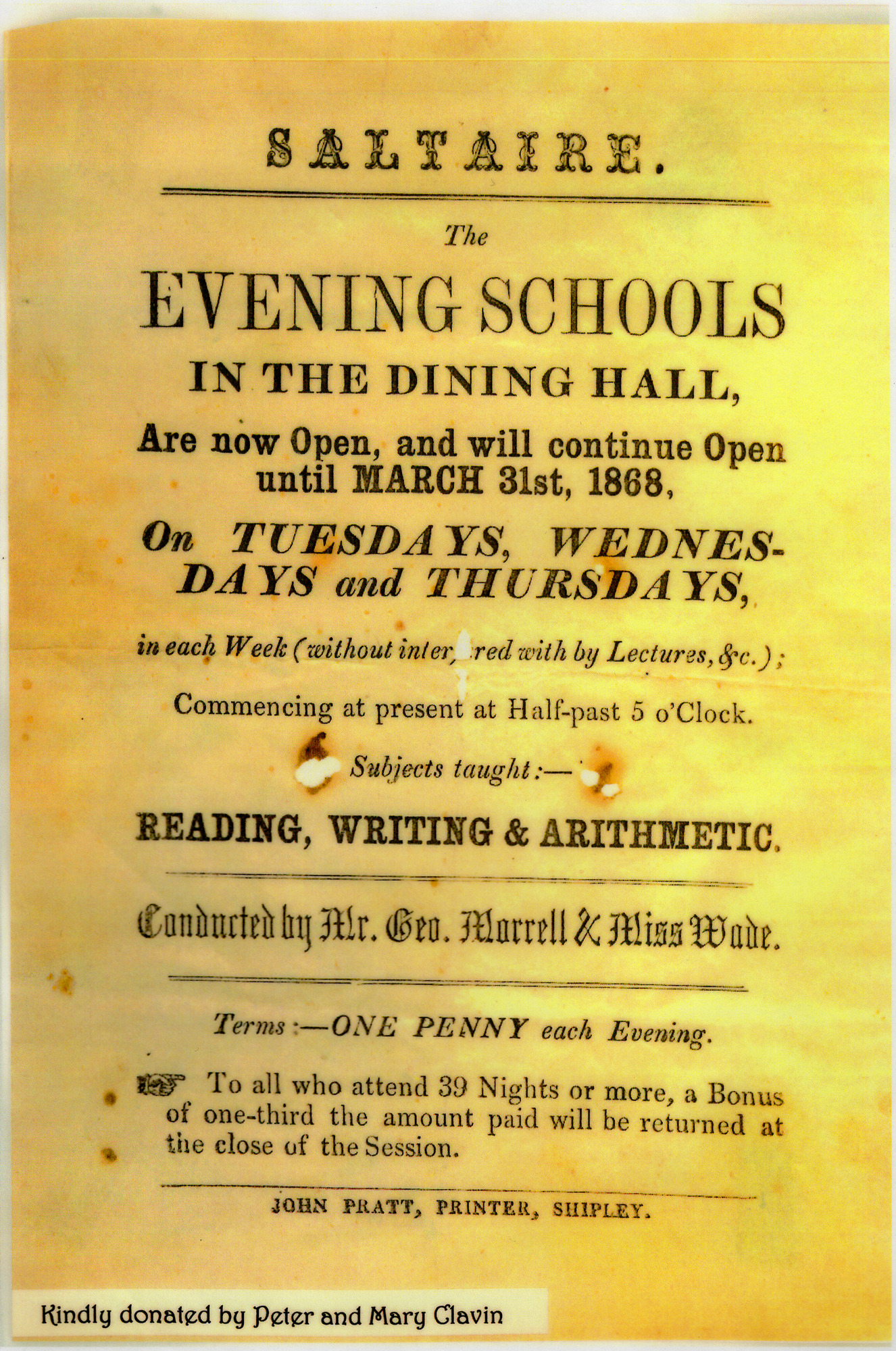 Copy of a notice 'Saltaire: The Evening Schools are now Open' (1867). The classes were held in the Dining Hall building of Salts Mill as no school buildings had yet been built in Saltaire. The poster advertises classes in reading, writing and arithmetic at a charge of 1 pence per class. The classes were to be given by Miss Wade and George Morrell (who had a 45 year career as a teacher in Saltaire).