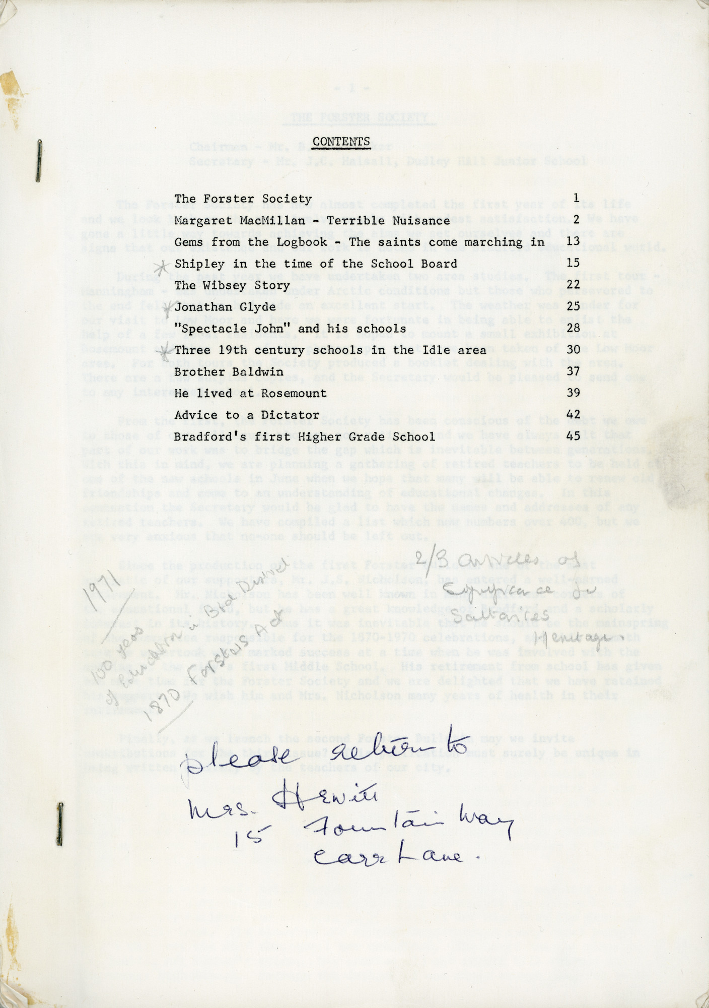Compilation of papers written by Bradford teachers. Includes 'Shipley in the time of the School Board' written by Margaret Cooper c.1971/72 as part of her teacher training studies. It contains an account of the schools in Saltaire at the time. Bulletin date C.1974