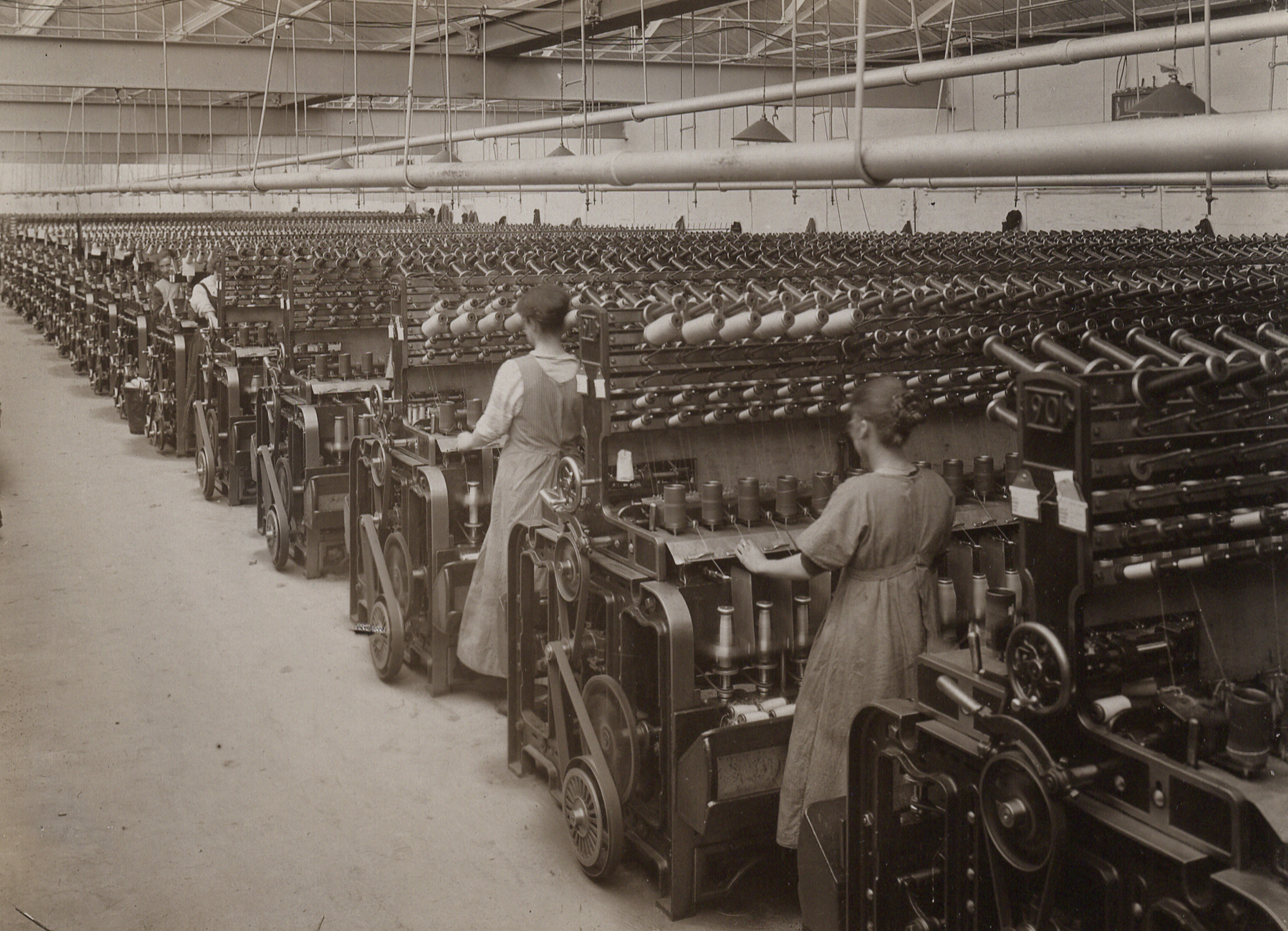 Photograph shows spinning room with spinning machinery down the right hand side of the room