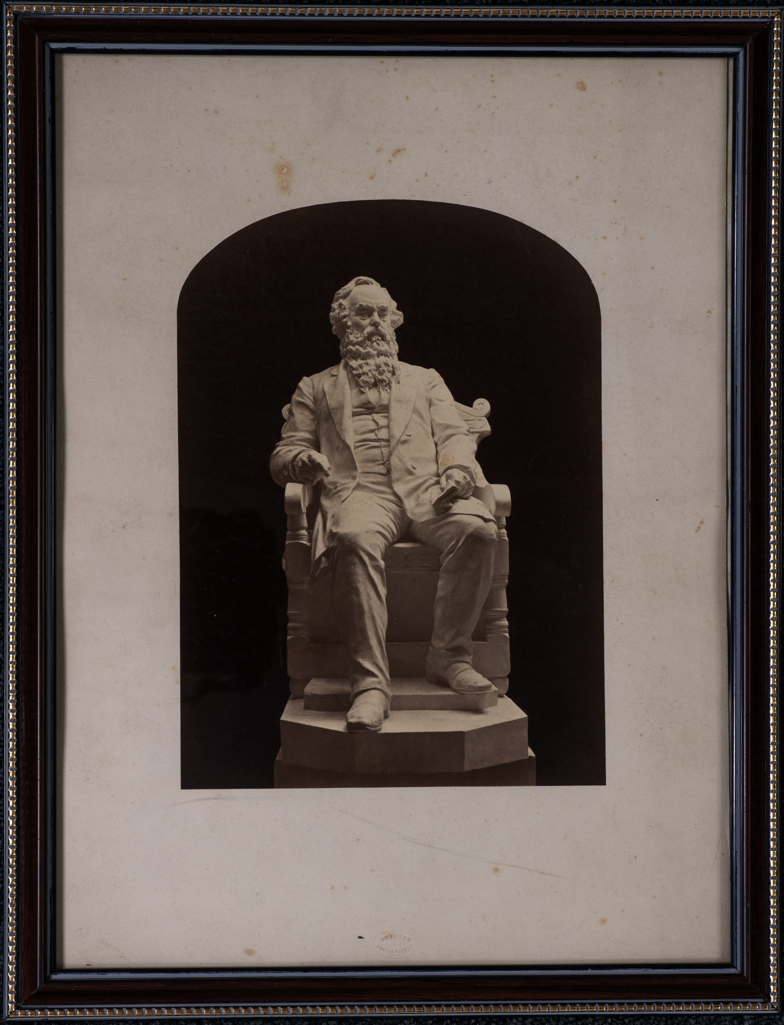 Original framed photograph of a statue of Sir Titus Salt. This appears to be the same design as the statue that was originally located outside of Bradford Town Hall in 1874 but is now located in Lister Park in Bradford. It is not clear whether the status pictured is the actual public statue, a copy or perhaps an initial small-scale design.