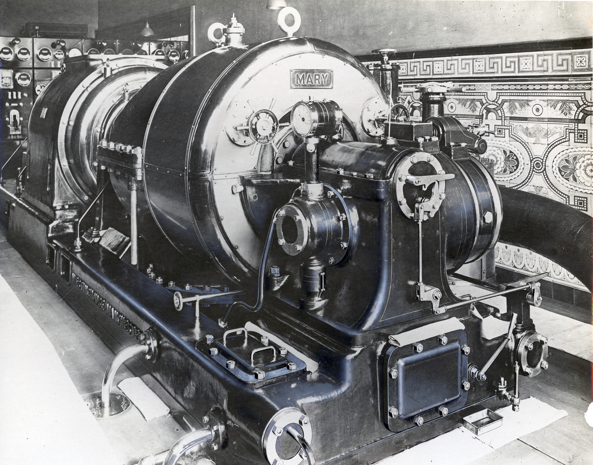 Photograph shows a close up of the steam turbine named 'Mary' after Sir James Roberts' granddaughter. The wall to the right is very ornately tiled.