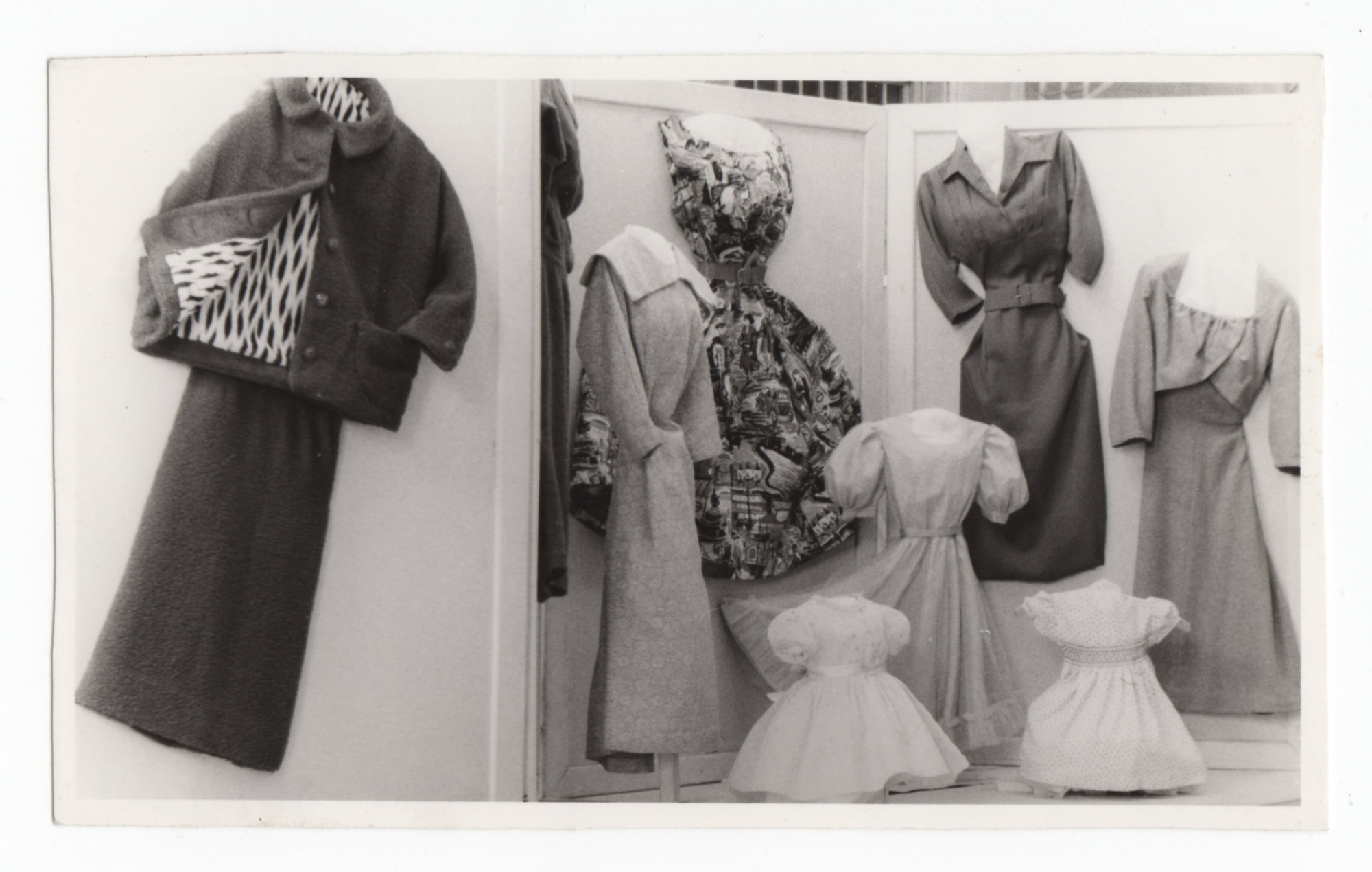 Black and white photo (13.5x8.5cm) of display of women and childrens textile garments