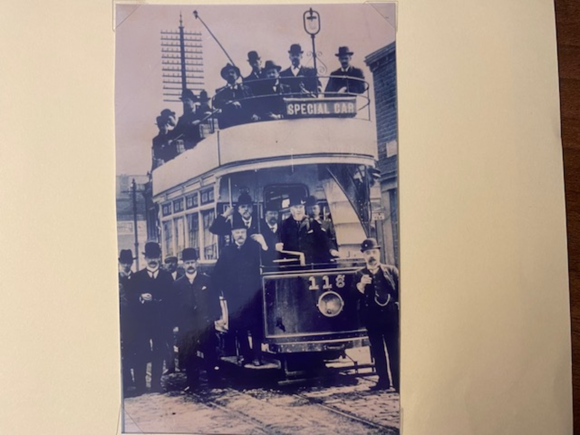 Photograph showing a group of men standing on the no 118 tram, sign reading 'special car'.
