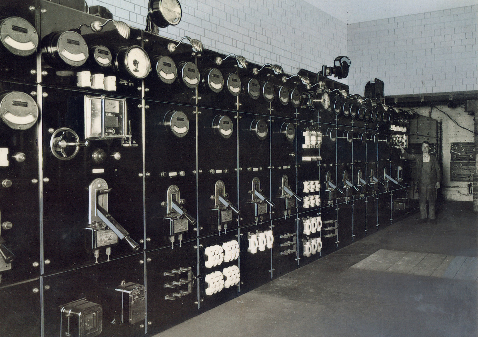 Photograph shows swtichgear down the left hand side with a man standing at the rear with his right arm raised. The switchgear is in the turbine house in the centre of the spinning block.
