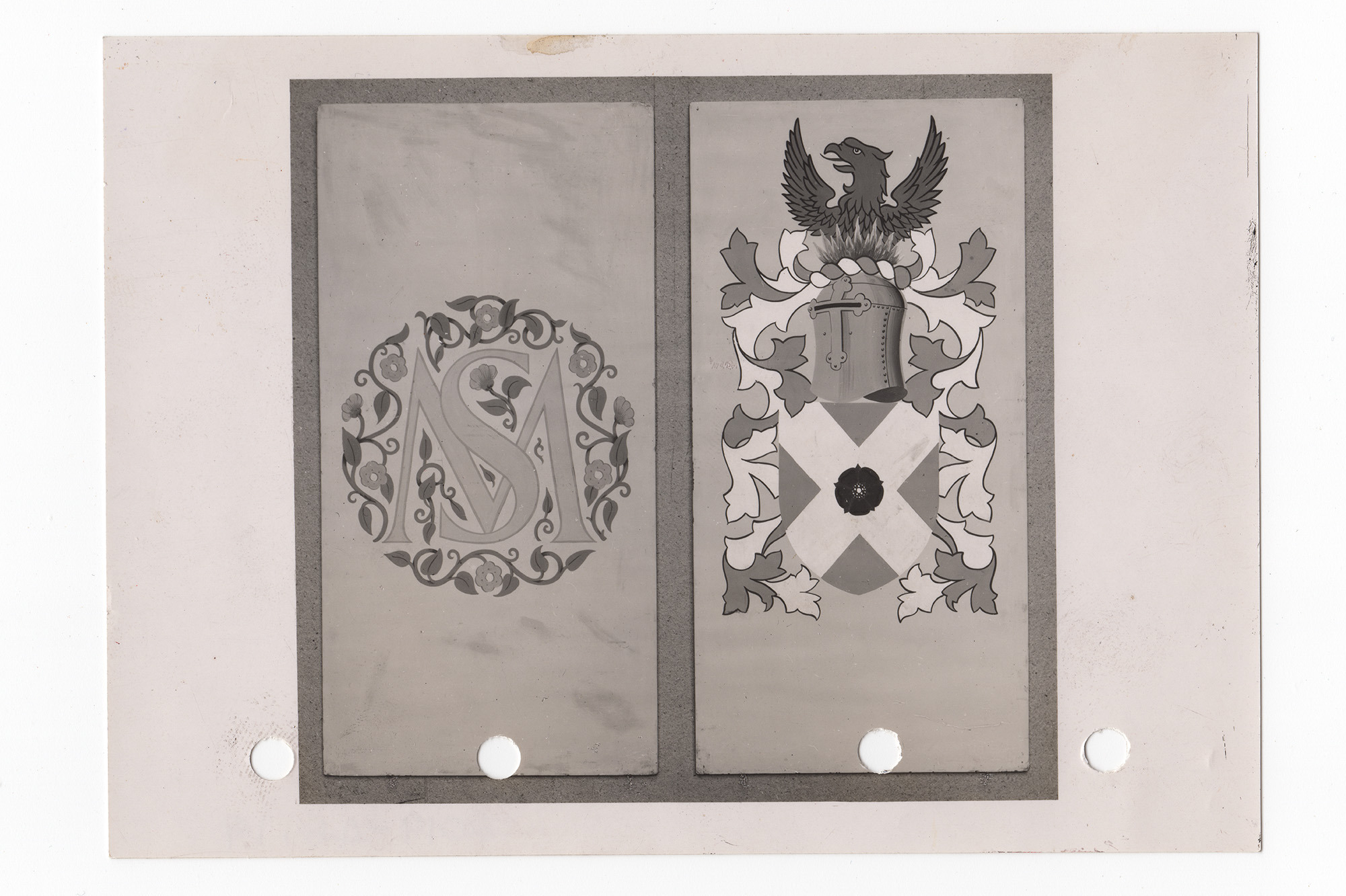 Black and white photograph 15.2cmx10.8cm of two crests. One circular with S overlaying M in the centre and surrounded by leaves and flowers. The second showing a shield with a diagonal white cross and rose in the centre, topped by a helment ad a bird. Leaf decoration runs down the sides of this crest. Four holes have been punched along the bottom of the print. The printed image on the paper is 10cmx9.6cm
