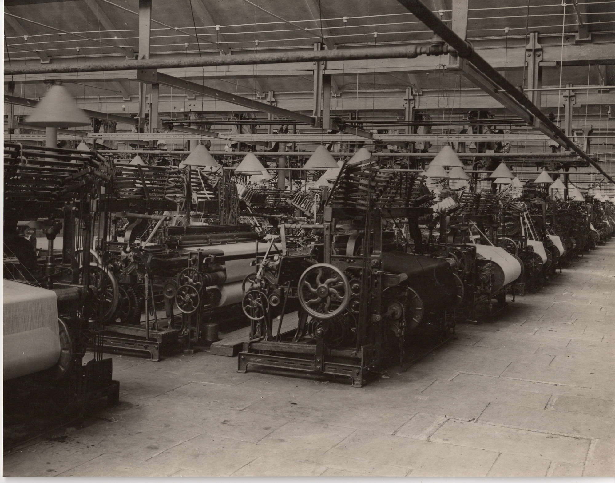 Photograph shows part of a weaving shed with lots of lampshades hanging above the machinery