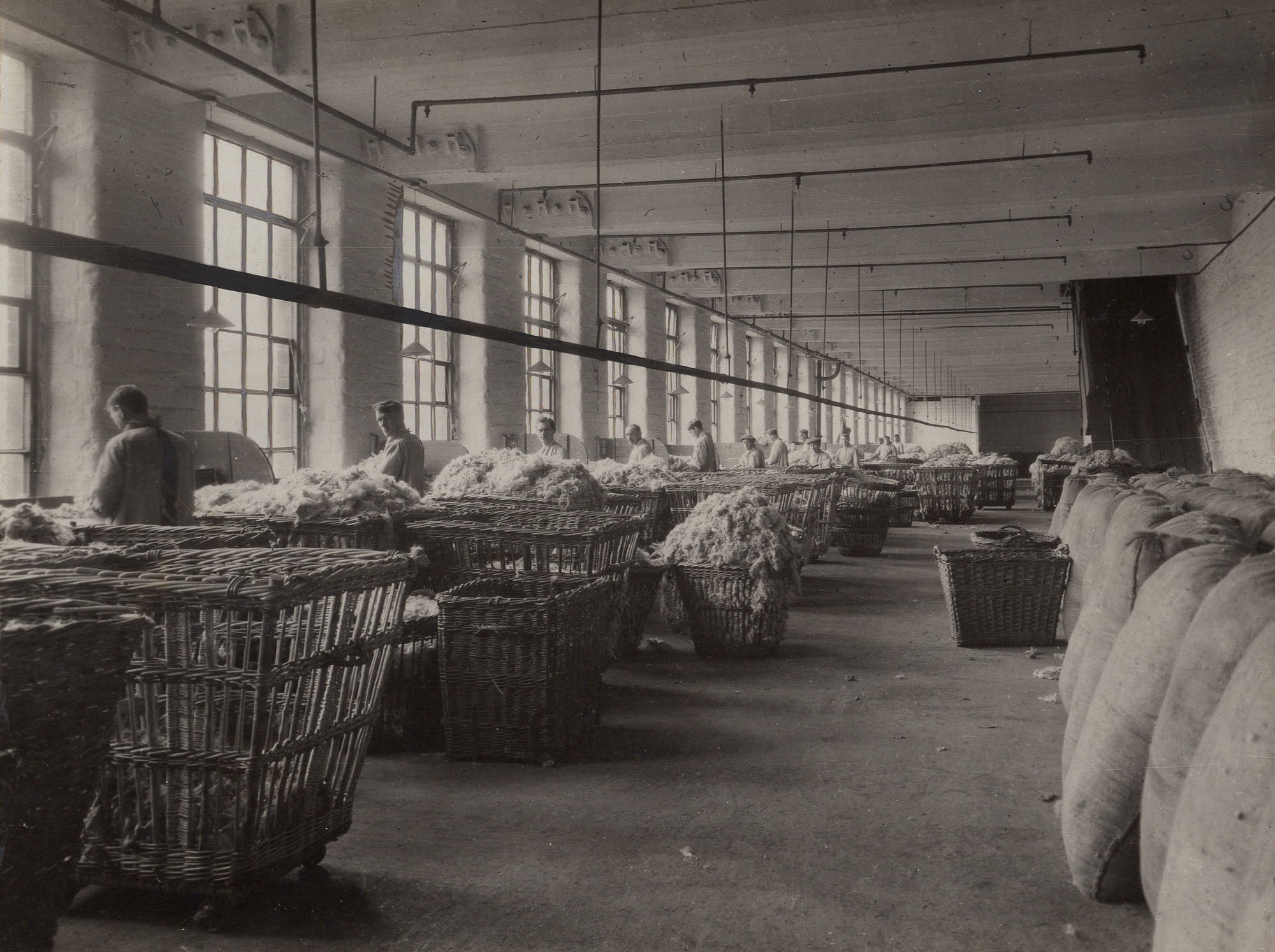 Photograph shows a number of men standing in front of windows sorting wool. There are a number of baskets containing fleece with one in the centre of the room piled high. To the right are a number of sacks with two empty wicker baskets in front of them.